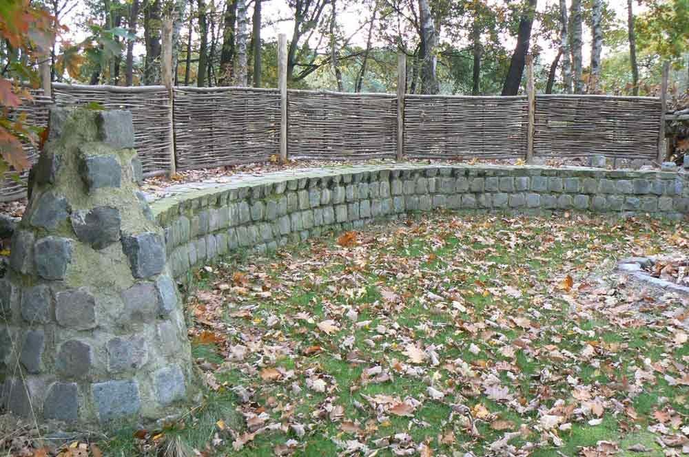 in een privaat bosbestand te Veerle-Heide : zitmuur in porfierkassei met