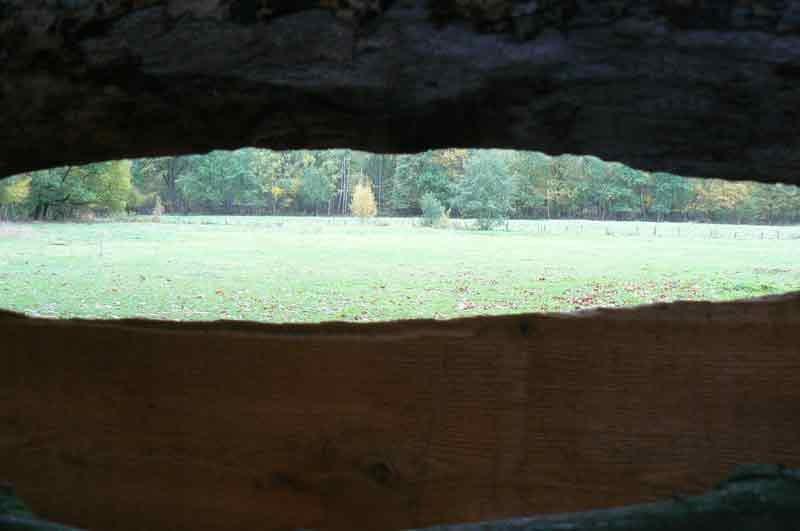 observatiehut met rechts het doorzicht van binnenuit de hut op het landschap :