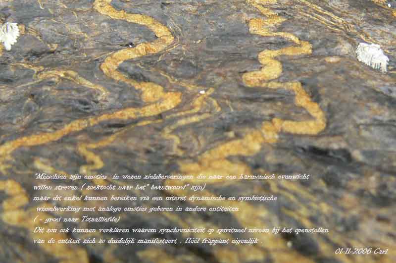 na een mooie reis in Cornwall was ik geïnspireerd om dit neer te schrijven ( aug. 2006) diepgang is de poort naar doorgang , zin voor diepgang maakt dieperliggende gevoeligheden en emoties los . daarom is het zo belangrijk om duidelijk te maken wat je werkelijk ZIELSMATIG voelt , zonder al te veel omwegen , recht vanuit je ware hart , los van je ego . dat vergt enige moed maar uiteindelijk worden we er allen beter van ! Angsten blokkeren ons daadwerkelijk voelen en misschien zijn de dieperliggende oorzaken van angsten net hetgene waar we onszelf nog het meeste moeten mee durven confronteren willen we bevrijd raken , sterker nog willen we eerlijk zijn tov onszelf én de ander , willen we Liefde bereiken .. hoe meer we onze diepe angsten "bevriezen" hoe meer we in situaties verzeild raken die ons daarop duiden , hoe meer we in situaties komen waar we ermee geconfronteerd worden misschien wel ? zich willen bevrijden , willen loskomen van angsten is heel geleidelijk angsten toelaten bij jezelf én de personen en situaties waarin je zielsmatig voelt dat dit toegelaten is én op het tempo en ritme van je eigen natuur . . door jezelf open te stellen jegens iedereen ,door je energie niet af te schermen maar open en bloot te geven reik je een immense kracht aan die streeft naar energetische harmonie in sterk dynamische zin . Afgeschermde positieve energie , uit angst , kan je immens moe maken zich openstellen voor diepgang kan uiteindelijk een doorgang betekenen naar een vrije doorstroming van energie , de weg naar een totaalharmonie waar Liefde het overkoepelende platform is voor rechtvaardigheid , vertrouwen , evenwicht , eenheid ,verbondenheid , ... natuur in z'n ongeschonden vorm is misschien wel de meest toegankelijke en meest concrete ,vatbare , onvervalste bron om jezelf te confronteren met wat je nu bent én waar je wezenlijk naartoe aan het groeien bent . Natuur is ongeconditioneerd ,universeel , oordeelt noch veroordeelt . Natuur projecteert je enkel een beeld waar je je voor open stelt , natuur kan je als geen ander wezen gidsen wat wezenlijk juist is . natuur heeft geen traumatisch verleden , heeft geen ego , geen eigenbelangen , ... Als we de observeren hoe de tegen de rotsen bonkende golven van de woeste zee schijnbaar heel disharmonisch en zonder enige regelmaat tegen de rotsen of kliffen uitéénspatten in waterpareltjes , vervolgens in zo'n homogeen kleedje en zachtheid van de rotsen glijden om uiteindelijk weer opgenomen te worden in de woestheid van de zee Als we proberen te ervaren met de ogen dicht en de geest helemaal open hoe het mulle , homogene zand langzaam door onze vingers glijdt, terwijl de kalme golfjes langzaam naar ons toekomen gegleden . Als we de immense stiltebeeld van een haast rimpelloze zee bij zonsondergang in een beschutte baai proberen te ervaren versus een woeste en wilde zee bij stormweder , als we die ervaringen toelaten ons helemaal te doordringen